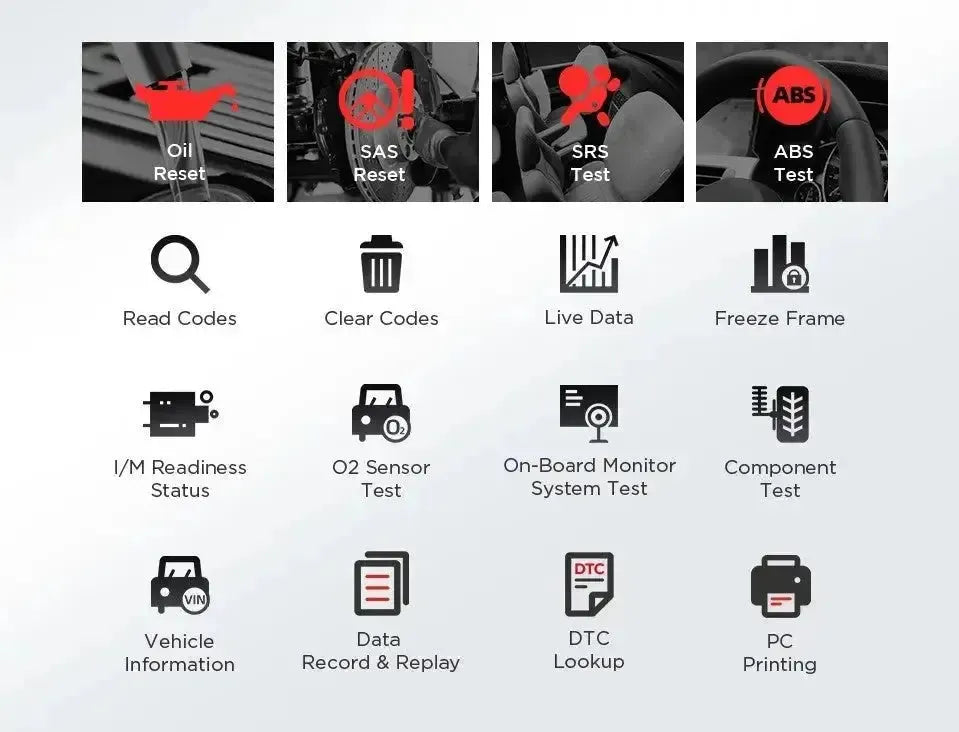 - Diagnóstico del sistema ABS & SRS: lee y borra códigos de error, muestra datos en vivo y realiza pruebas activas en los sistemas ABS y SRS para 42 marcas de automóviles. Esto ayuda a localizar rápidamente fallos en los sistemas de frenos y airbags.